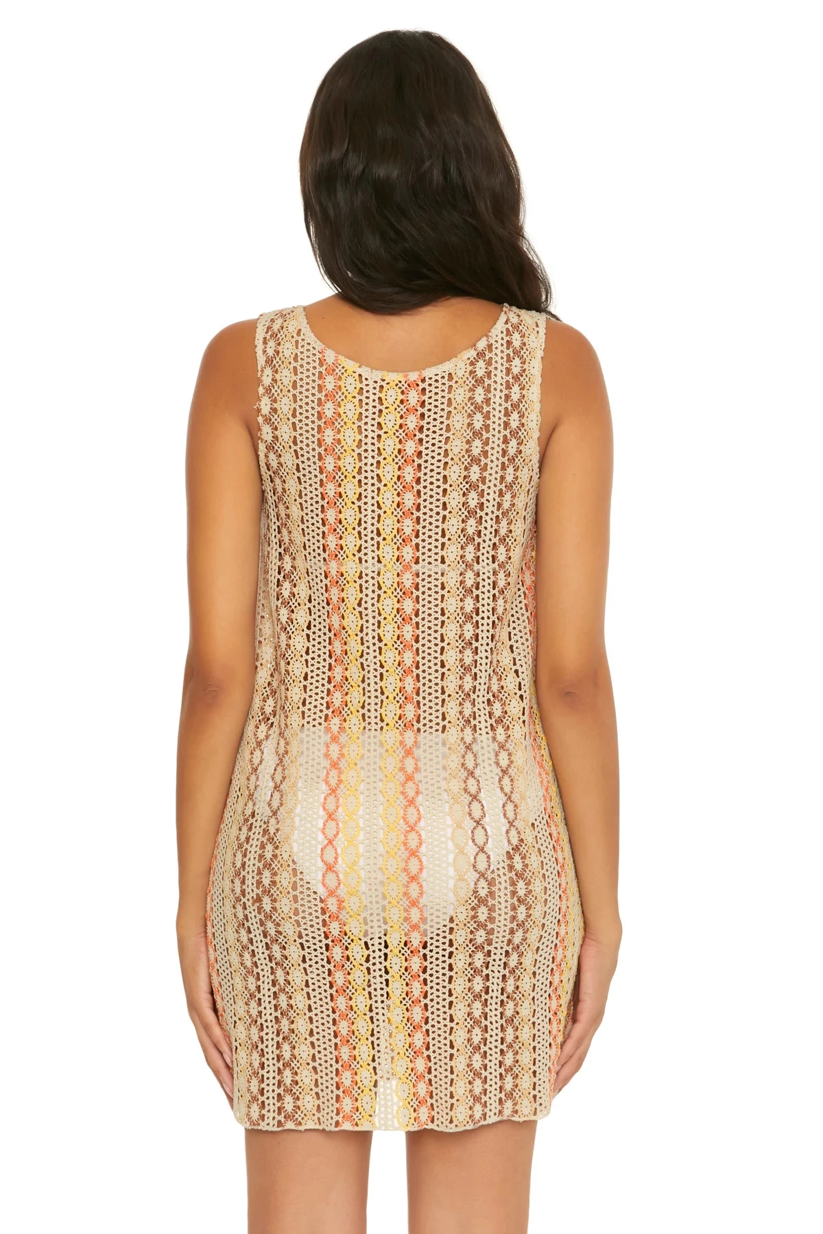 Aruba mini dress features a crochet vertical stripe design and offers a v-neckline with a pull over fit.