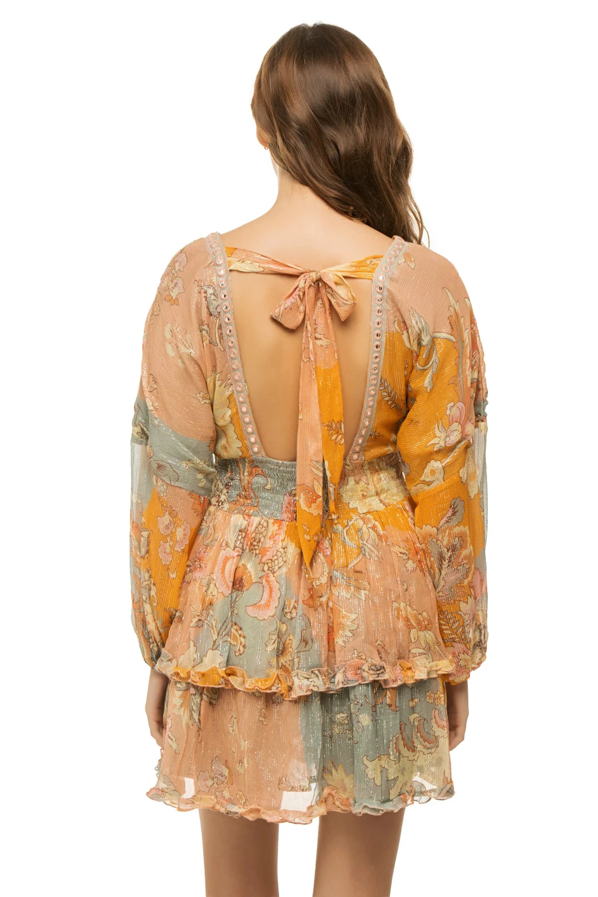 Azulejo mini dress features a metallic floral print with ruffle details and a v-neckline. Offers smocking detail at waist, long sleeves and a tie back closure.