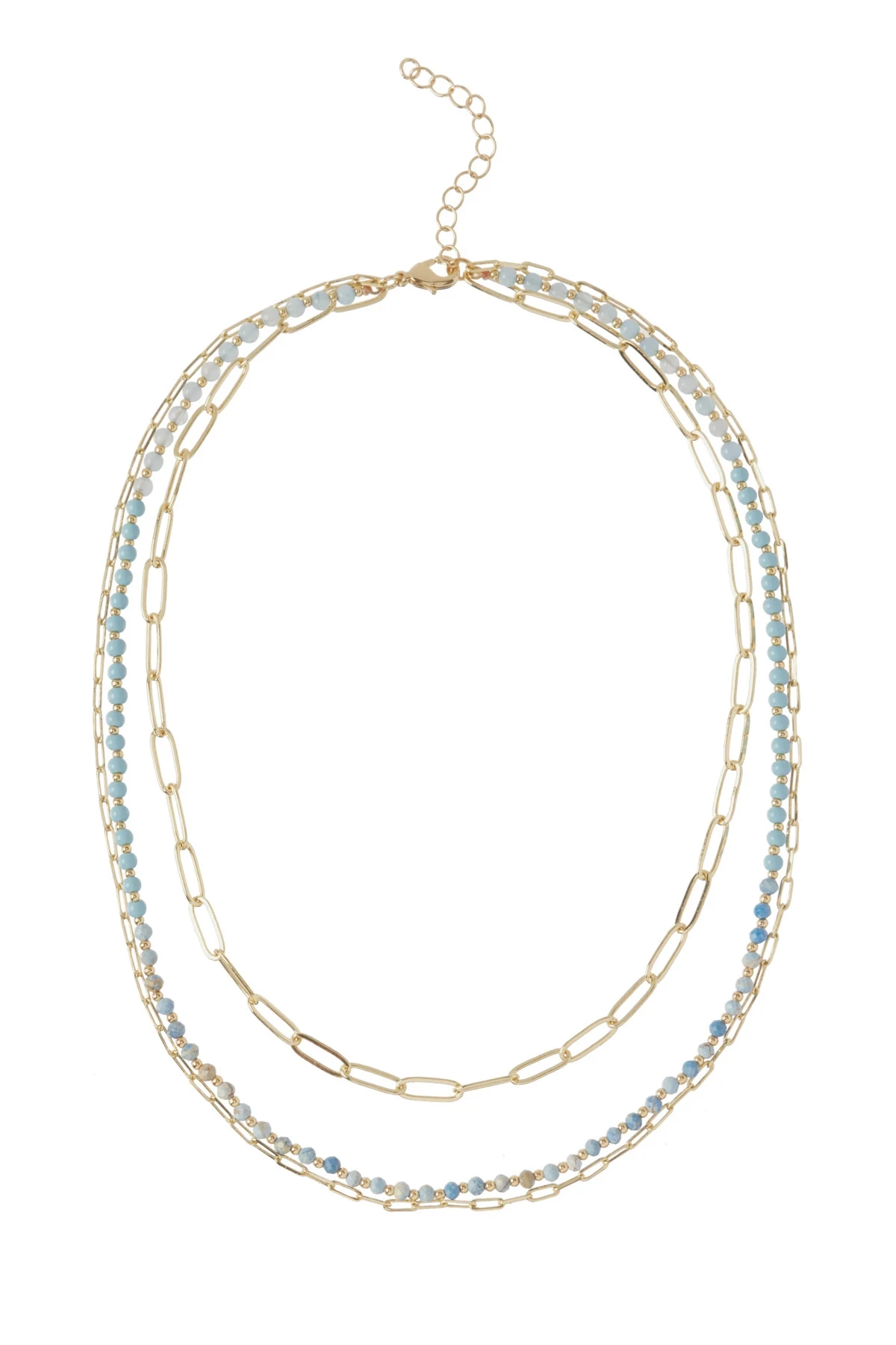 Golden necklace features airy chain links embellished with blue stone accents. Lobster clasp closure.