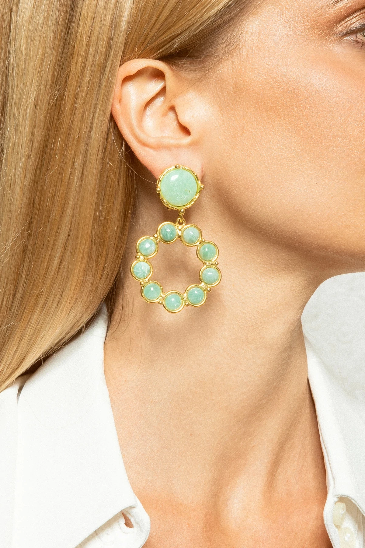 Boucles D’Oreilles Flower Candies earrings are hand-crafted 22k yellow gold-plated brass earrings accentuated with amazonite gemstones with clip back posts.