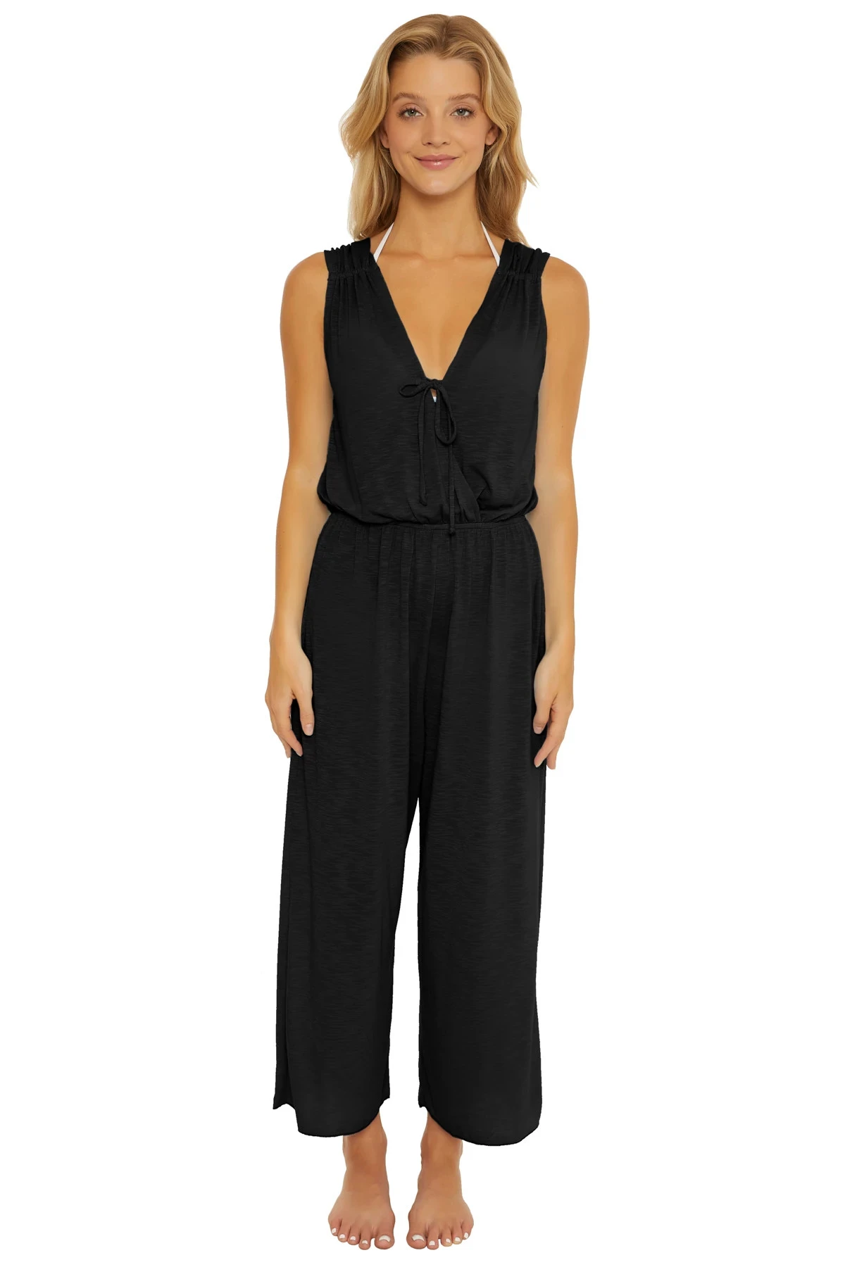 Breezy basics jumpsuit features a ruched waistline, wide straps, and a front tie detail.