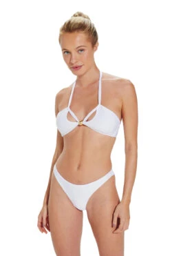 Brenda halter bikini top features a cutout bra with bead detail. Offers adjustable halter ties, removable cups and a gold clasp closure.