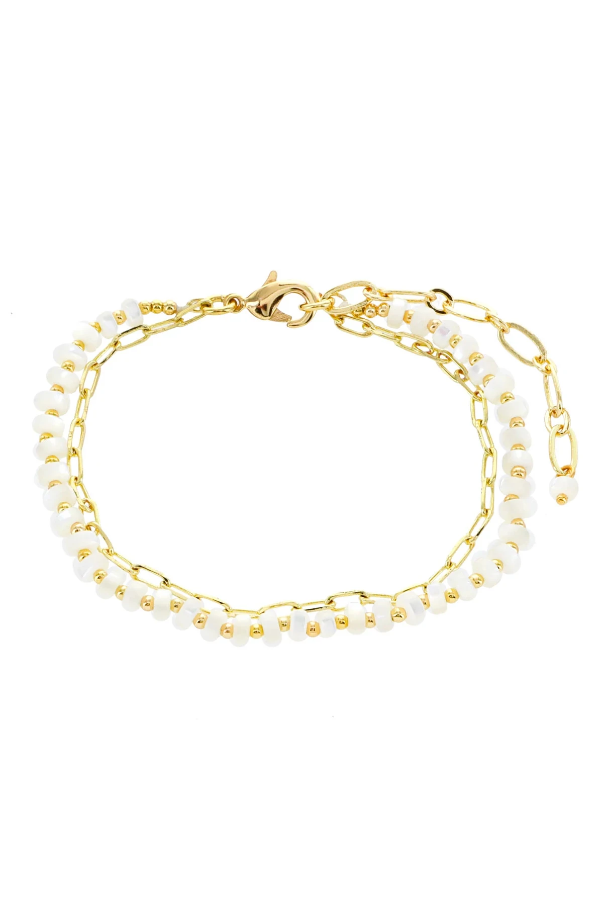 Bracelet features a cable link chain and a white cat’s eye beaded chain.