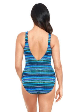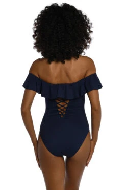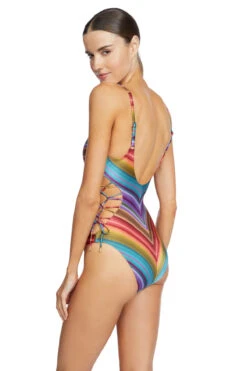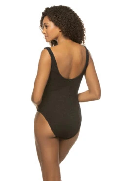 Celine halter one piece swimsuit features a gold fleck shimmer fabrication with a crisscross halter neck that leaves an open back and front center cutout. Offers a ruched front and back waist and moderate bottom coverage.