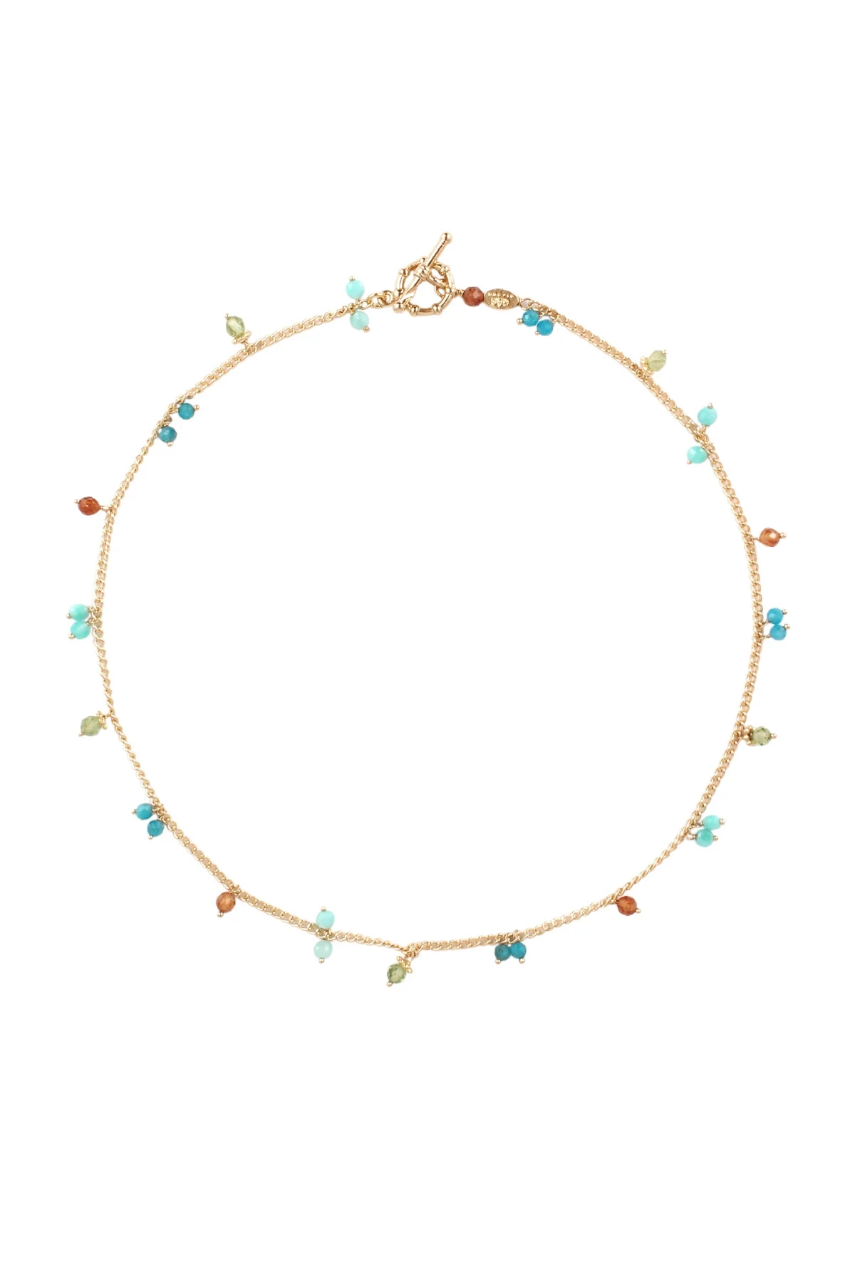 Collier tangerine necklace features 24k gold-plating adorned with semi precious stones and glass beading.