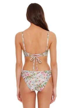 Triangle bikini top features a vibrant tropical print that reverses to a beautiful hand crafted crochet. Offers removable soft cups and adjustable neck and back ties with bead details.