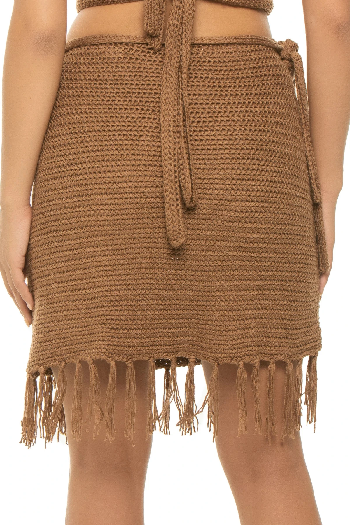 Crochet mini skirt features a wrap front with a fringe hem.