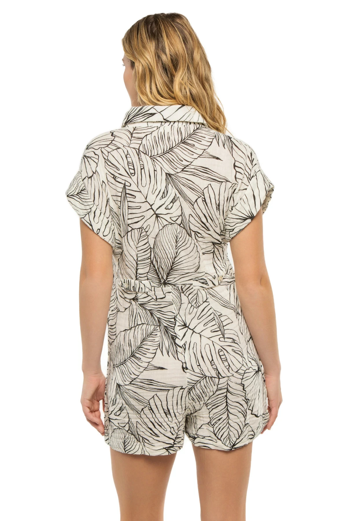 Romper features a collared v-neck, short sleeves and front pockets.