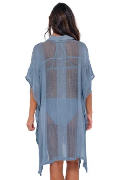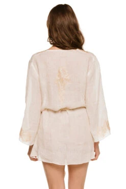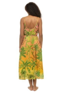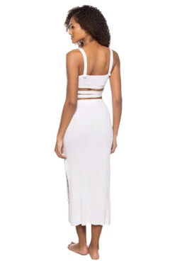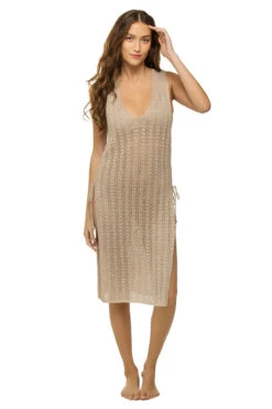 Elba metallic crochet midi dress features a plunging neckline with lace up ties at hips and large side slits.