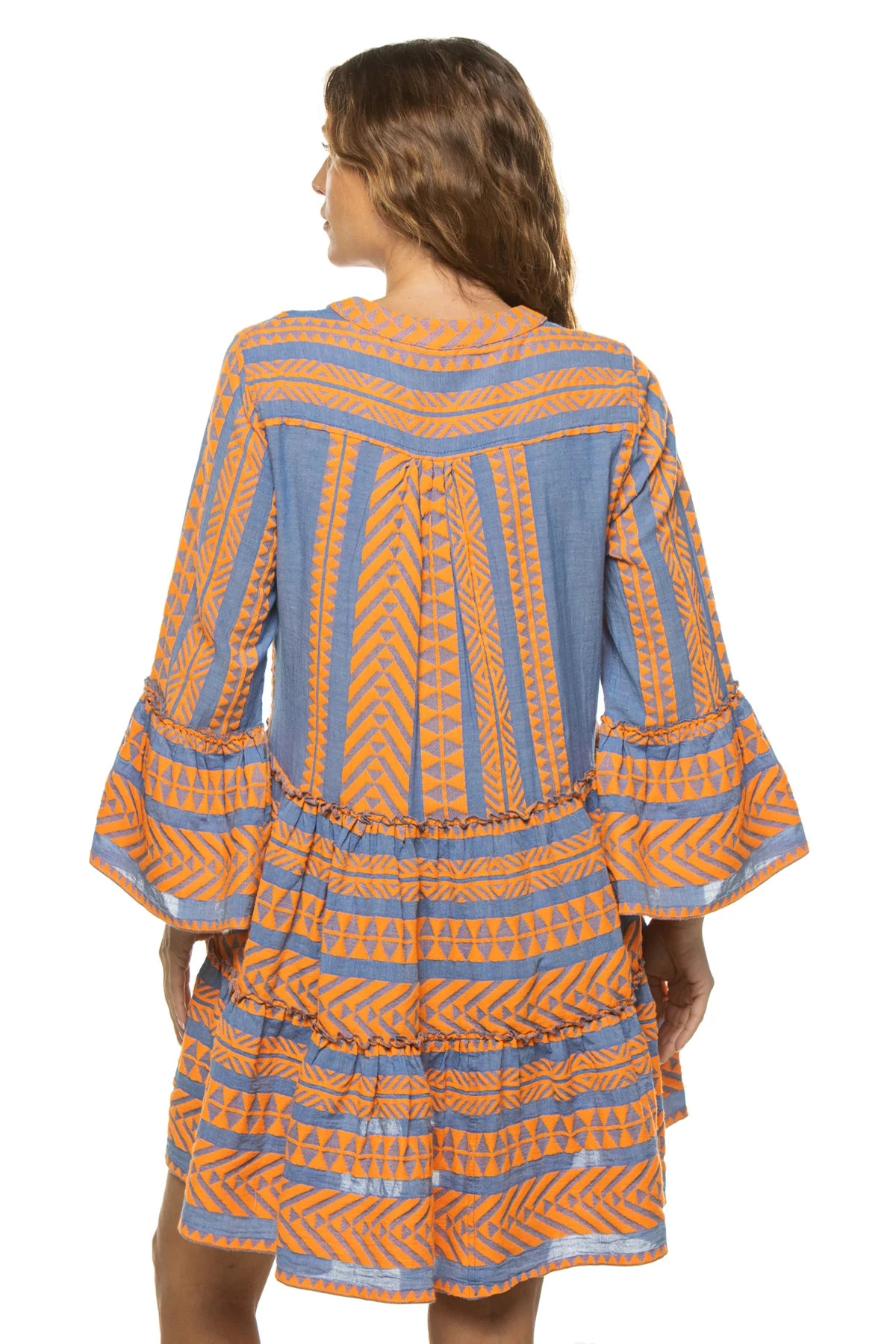 Ella dress features embroidered detailing, split v-neckline, flared 3/4 sleeves, and tiered skirt.