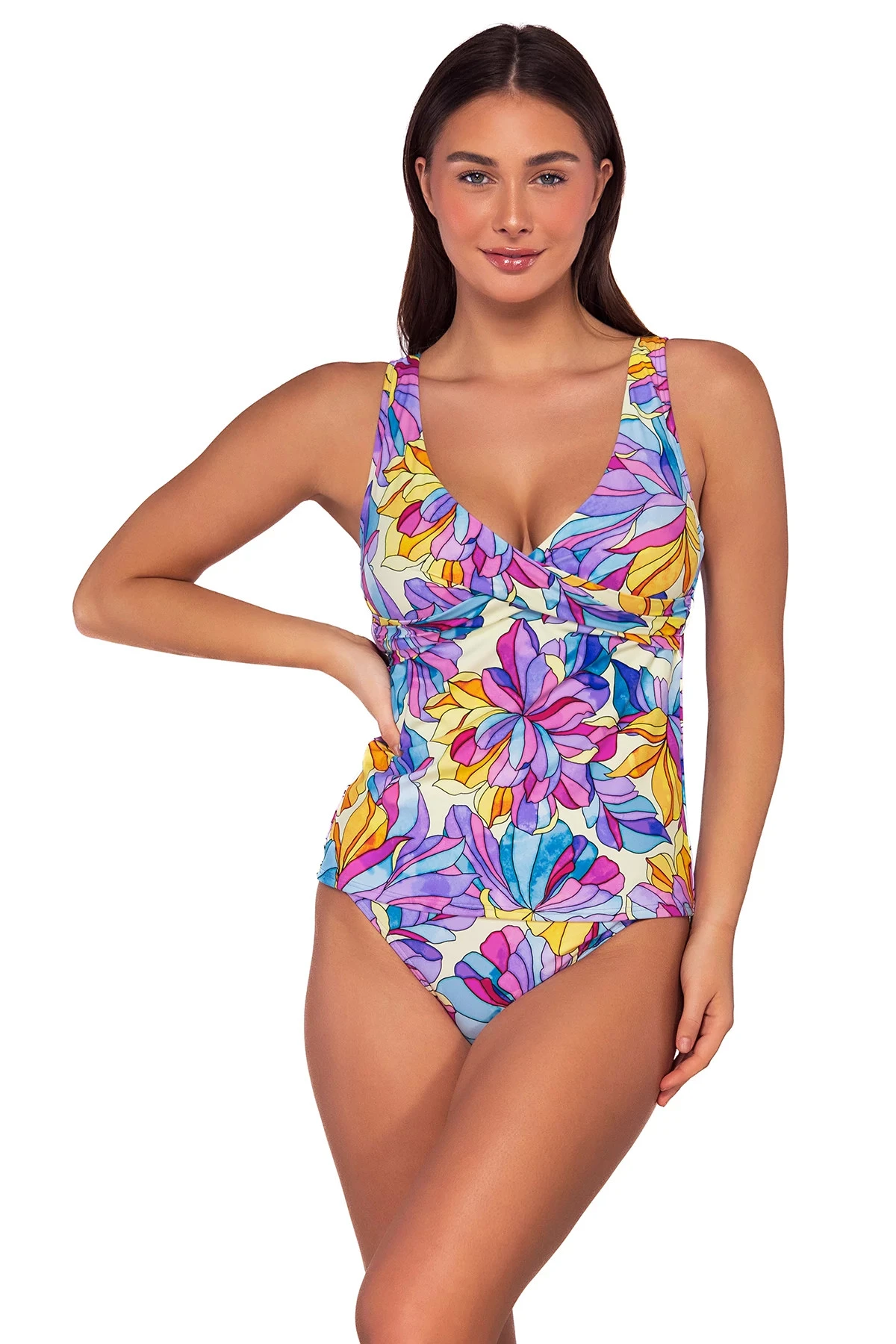 The Elsie Tankini provides sophisticated coverage and comfort. A “V” neckline, wide shoulder straps, and relaxed fit. A cute crossover neckline is a subtle and flattering accent. This tankini has an underwire, j-hook, adjustable straps, removable cups, and a hidden bra hook and eye closure.