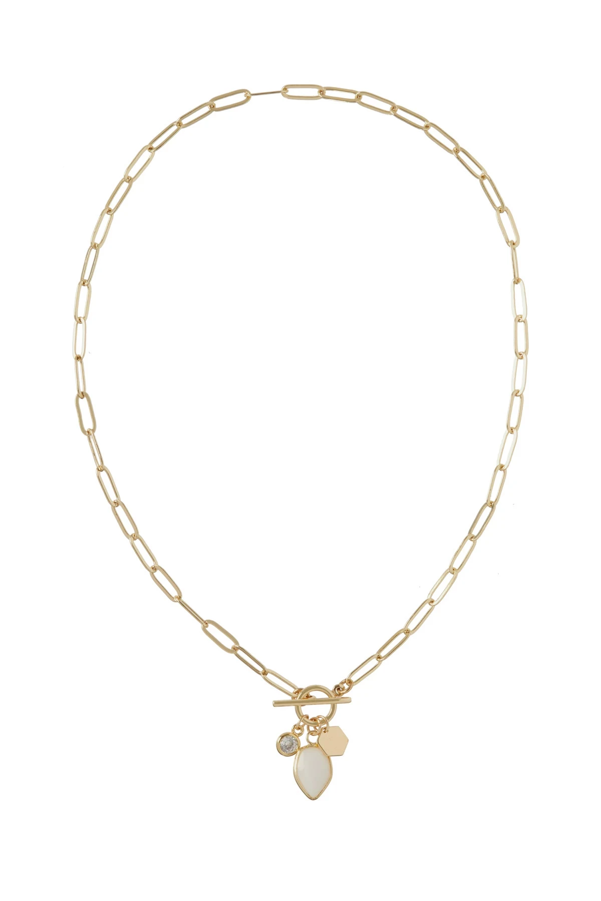 Necklace features a paperclip chain with enamel heart, rhinestone and gold charm accents and offers a toggle clasp closure.