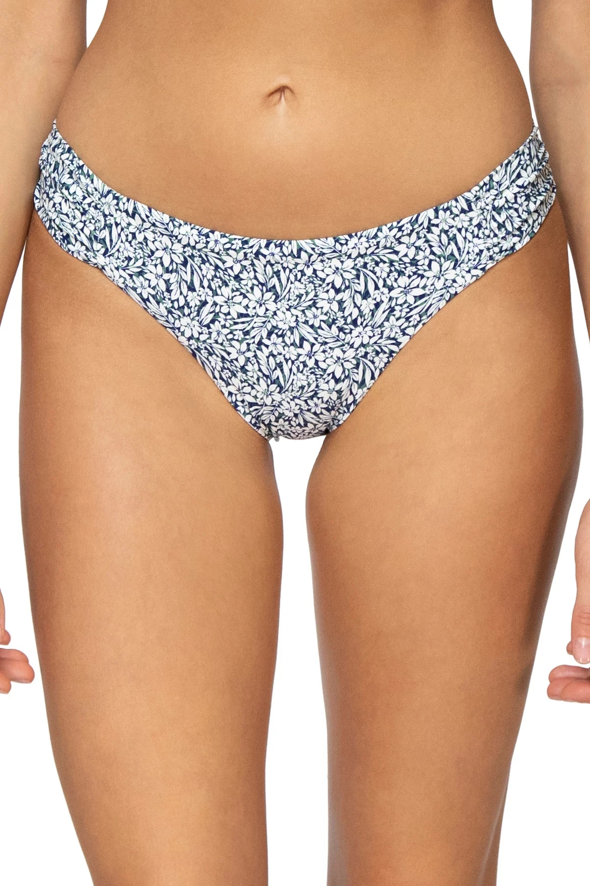 Perfect for the woman who wants a classic bottom, but wants to camouflage certain areas. The side shirring looks flattering on the hips and the soft tab sides avoid any unwanted pressure on the hips. Features include self lined front and back matching colored lining. Sits straight across the hip.