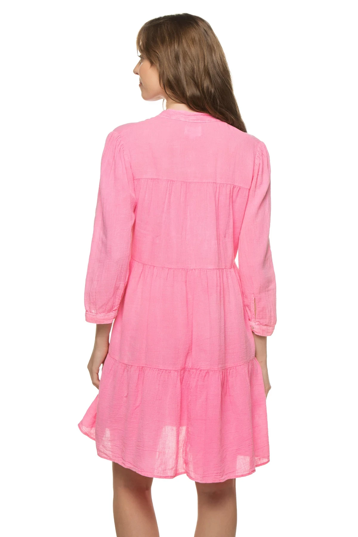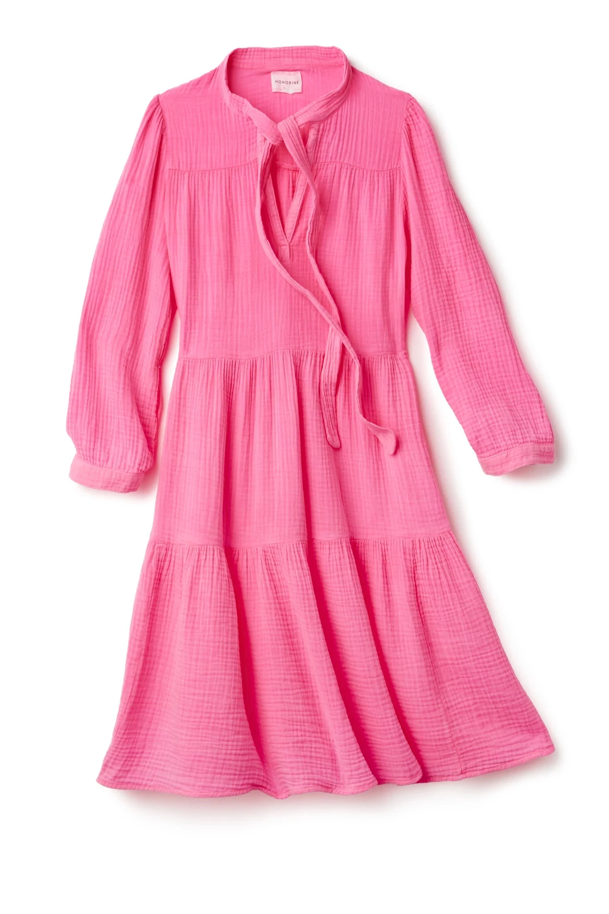 Giselle mini dress features a muslin cotton texture and offers a collared neckline with long sleeves.