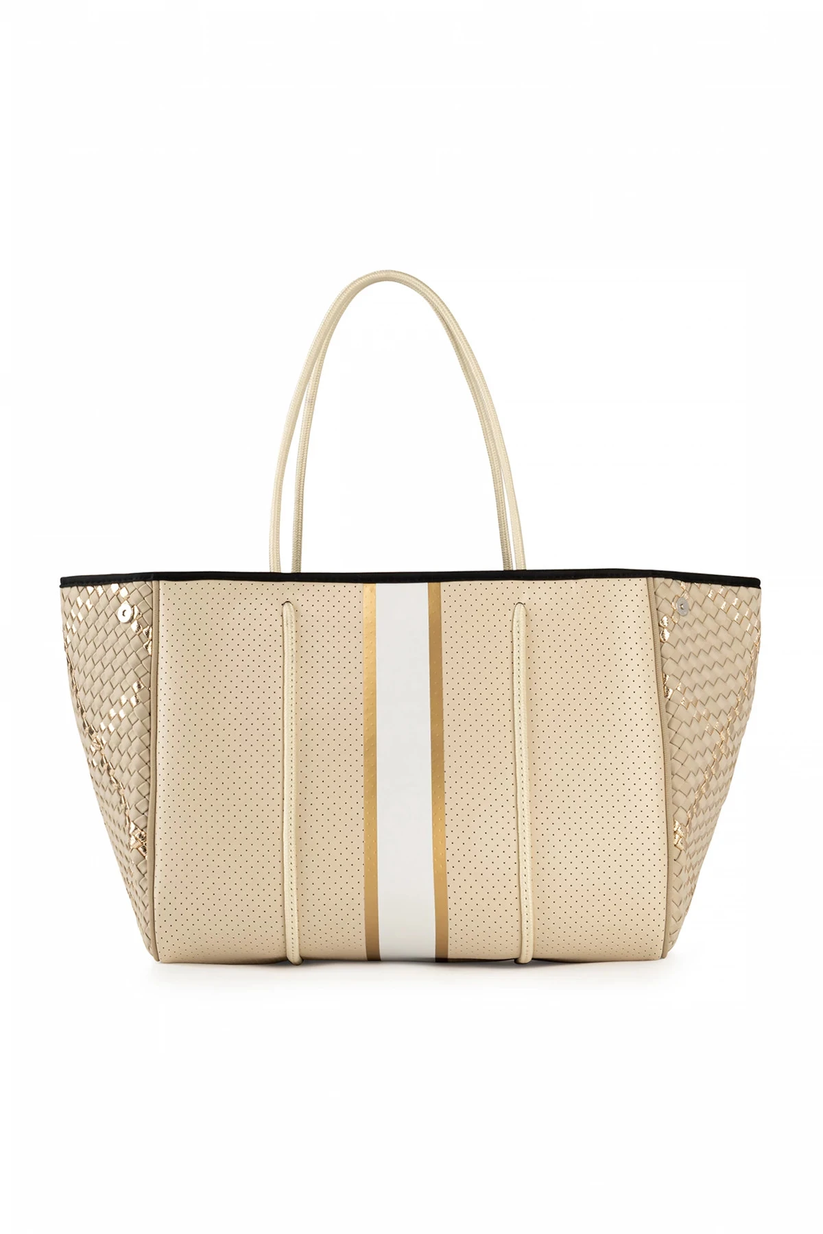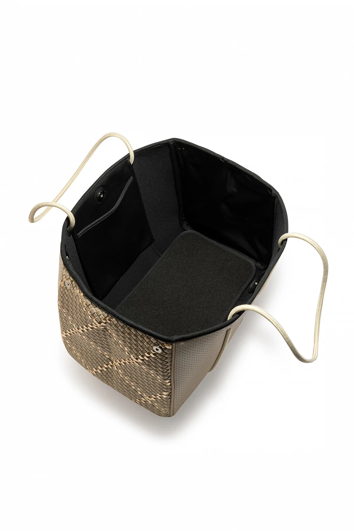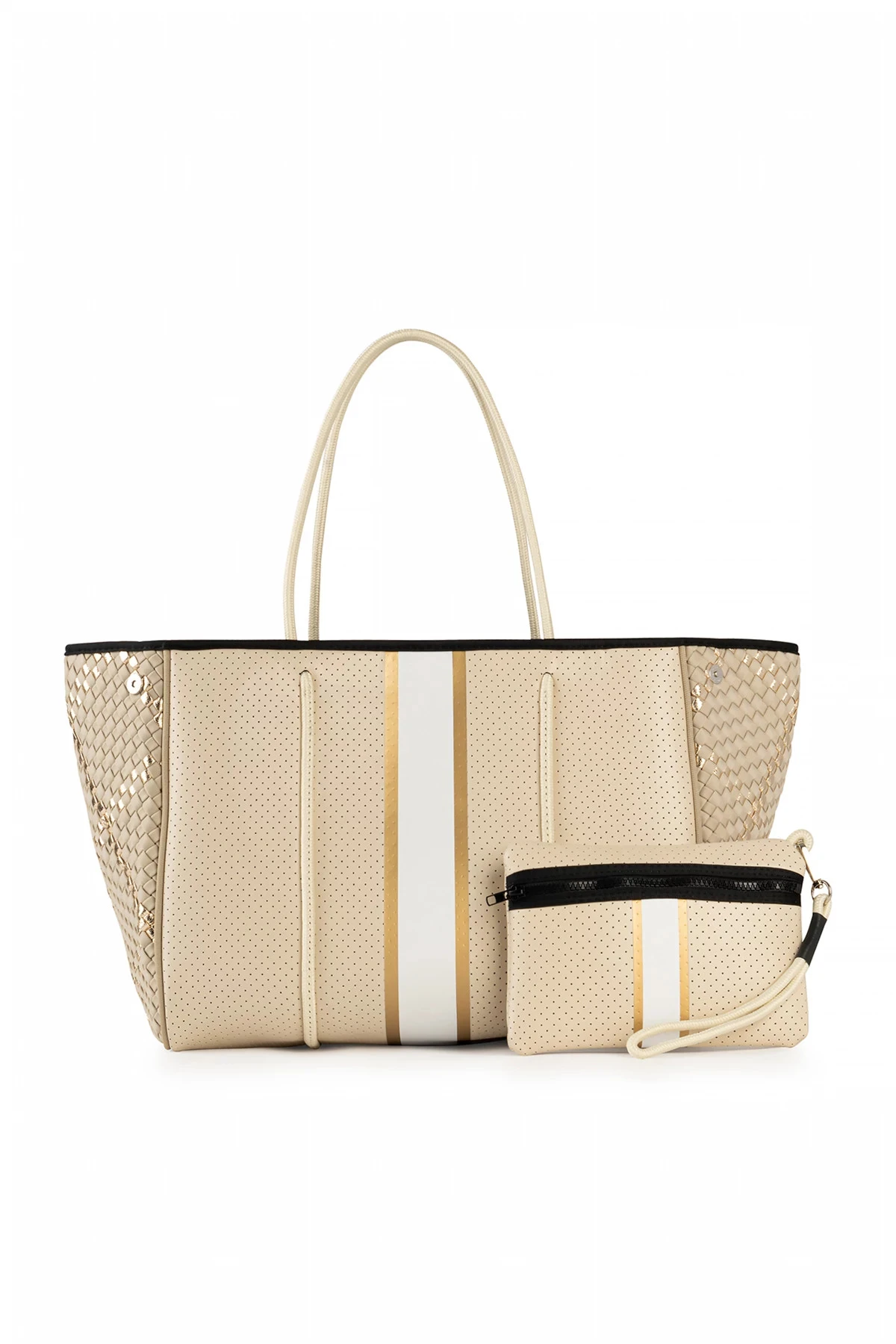 Greyson neoprene tote features woven sides with expandable panels. Offers a removable hard bottom liner and includes an interior wristlet pouch.