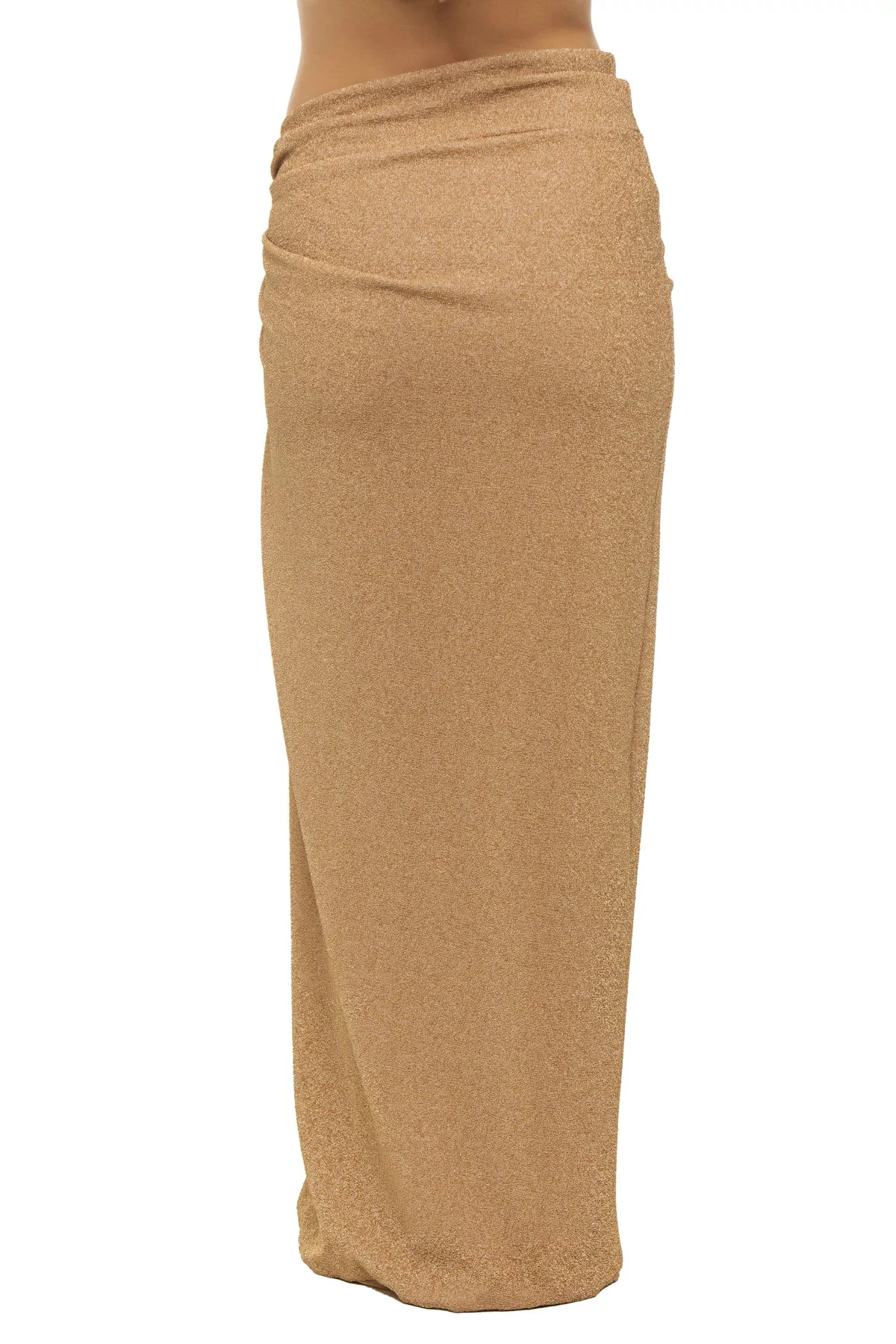 Gwen maxi skirt features a metallic texture and offers a knot detail at waist and a side slit.