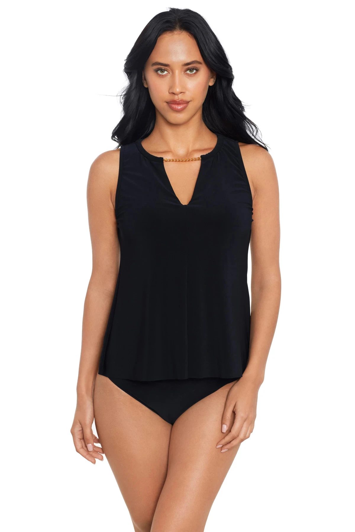 Chanae tankini top features a high neckline with a gold chain accent and offers removable soft cups.