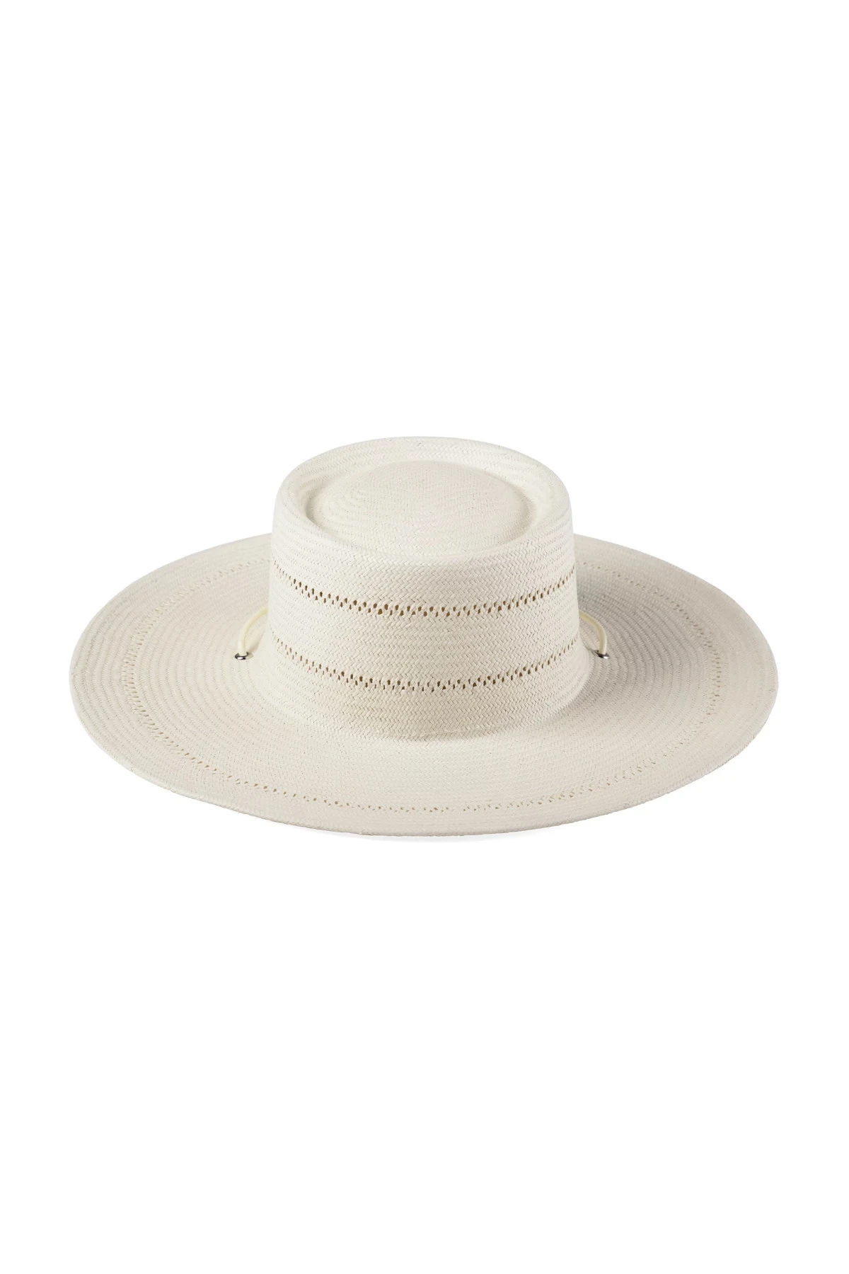 Jacinto sun hat features a paper straw fabrication offering a chin strap with a beaded toggle and sun freckle holes at the brim and crown.