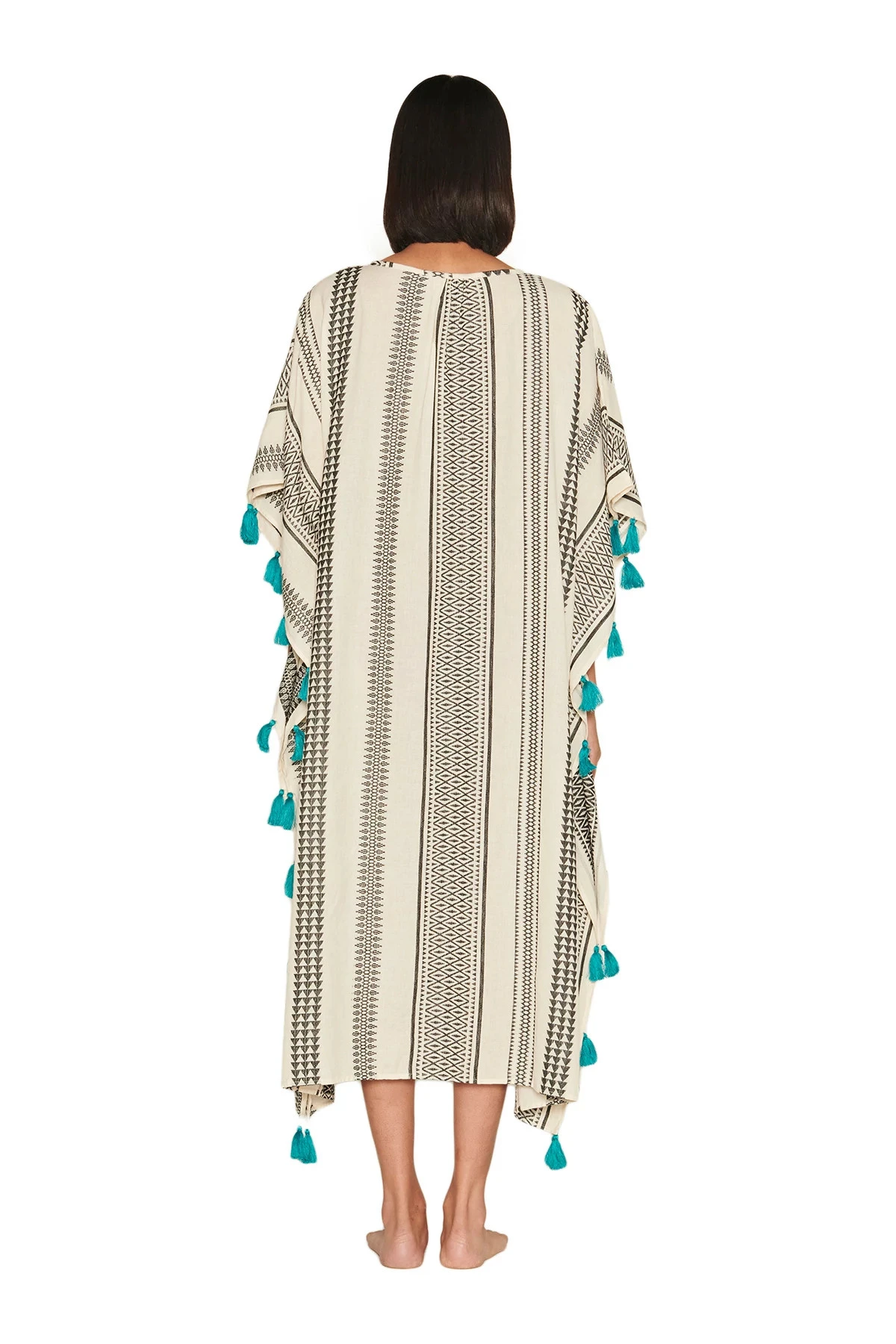Jamaica caftan features contrast tassel trim and a scoop split neckline that offers a button closure.