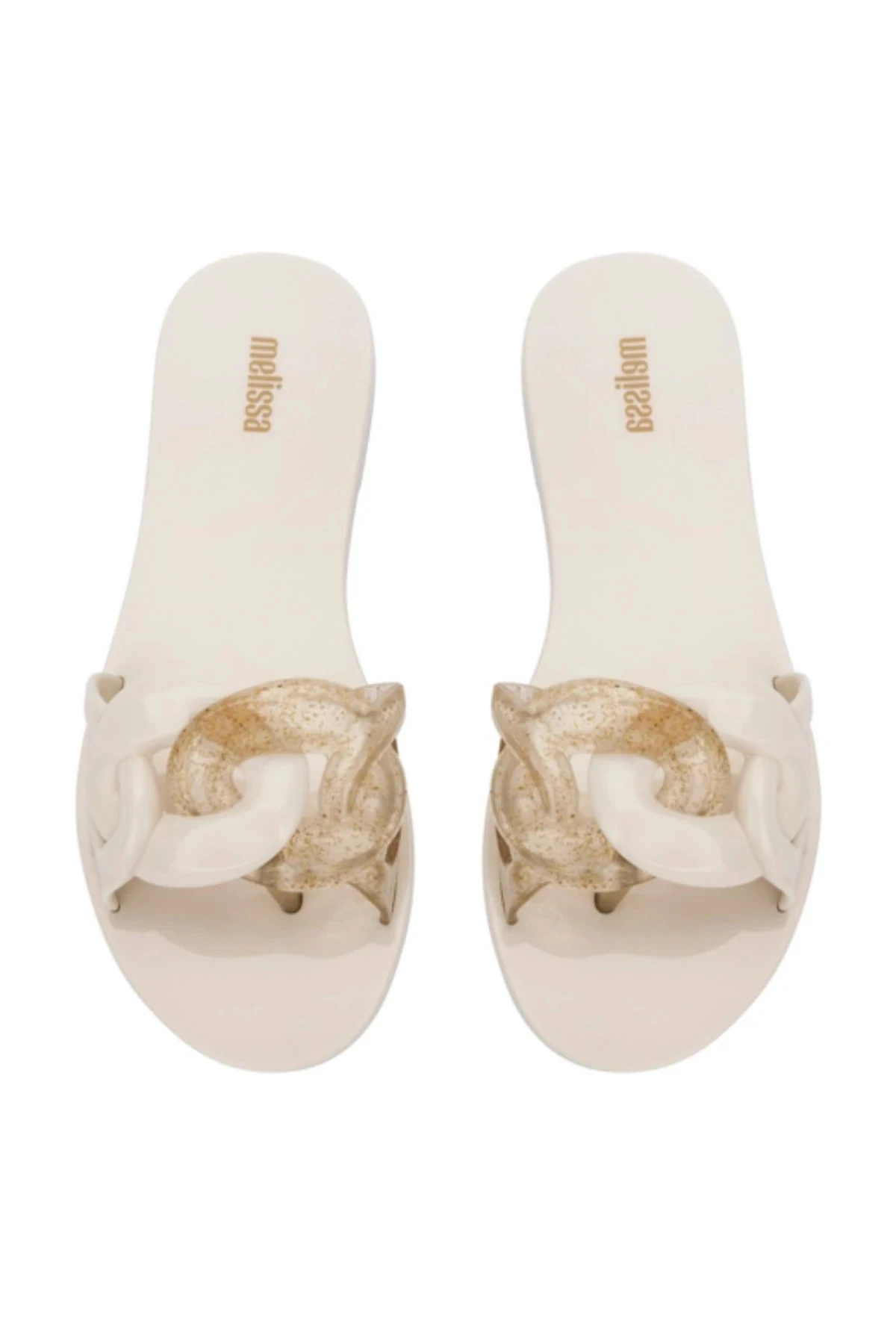 Jelly slide with chain strap detail.