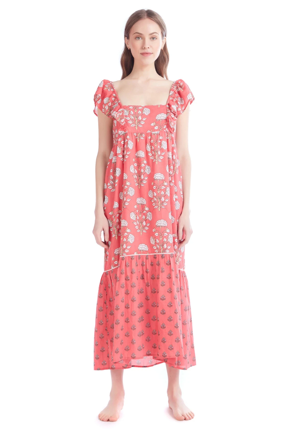 Jimmy midi dress features a straight neckline with elastic flutter sleeves, an empire waist and a tiered skirt.