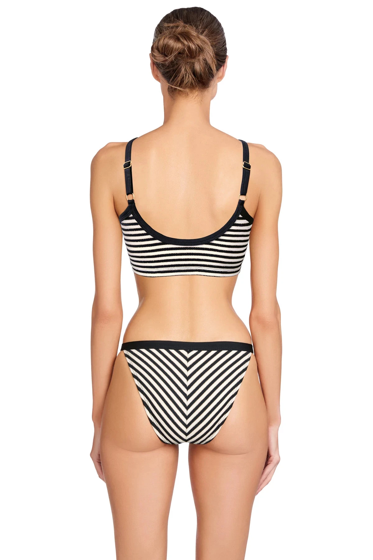 Jules tank bikini top features a striped print and offers removable soft cups with adjustable straps.