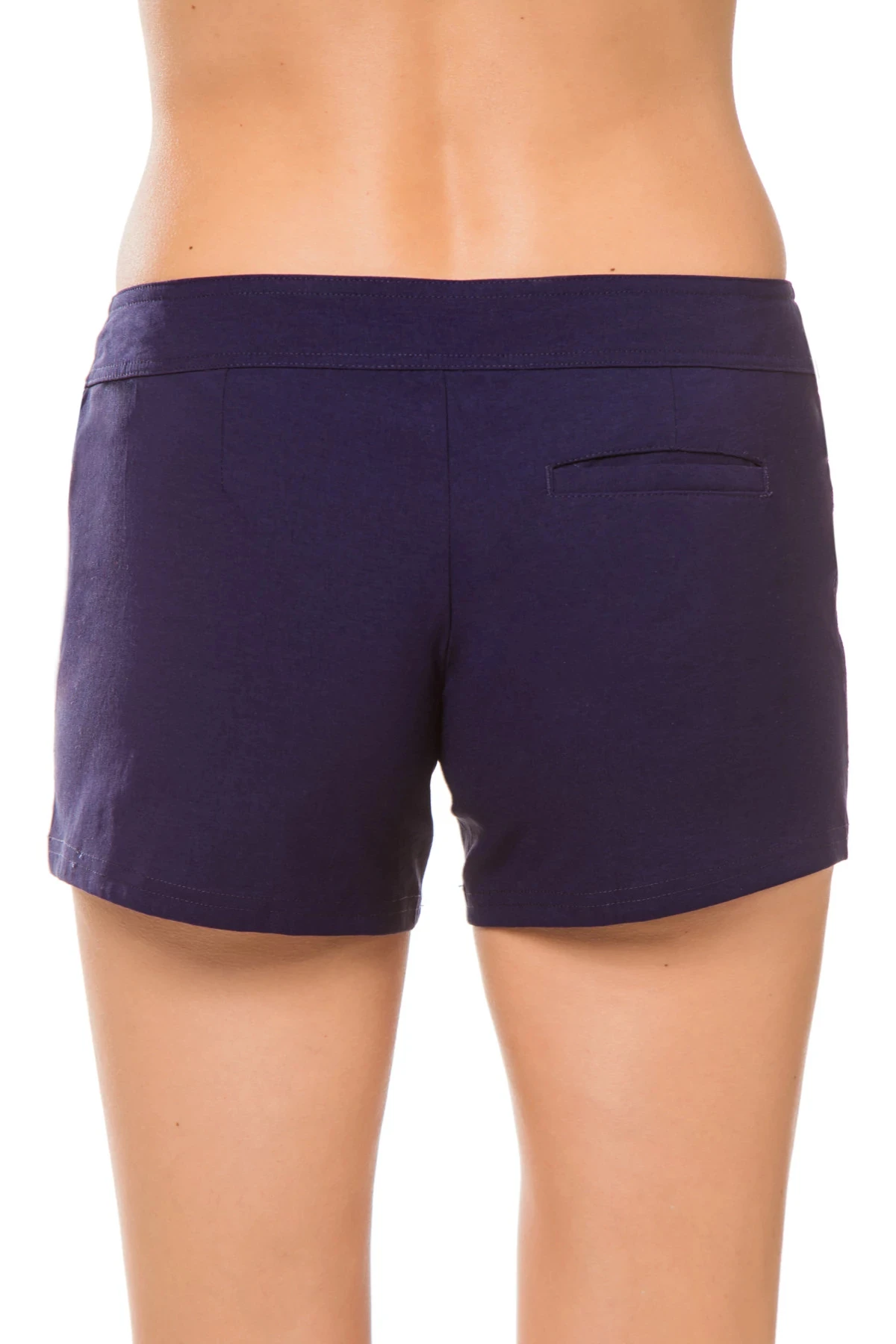 4″ Lace up board shorts feature adjustable corset lace up front with gold accents.