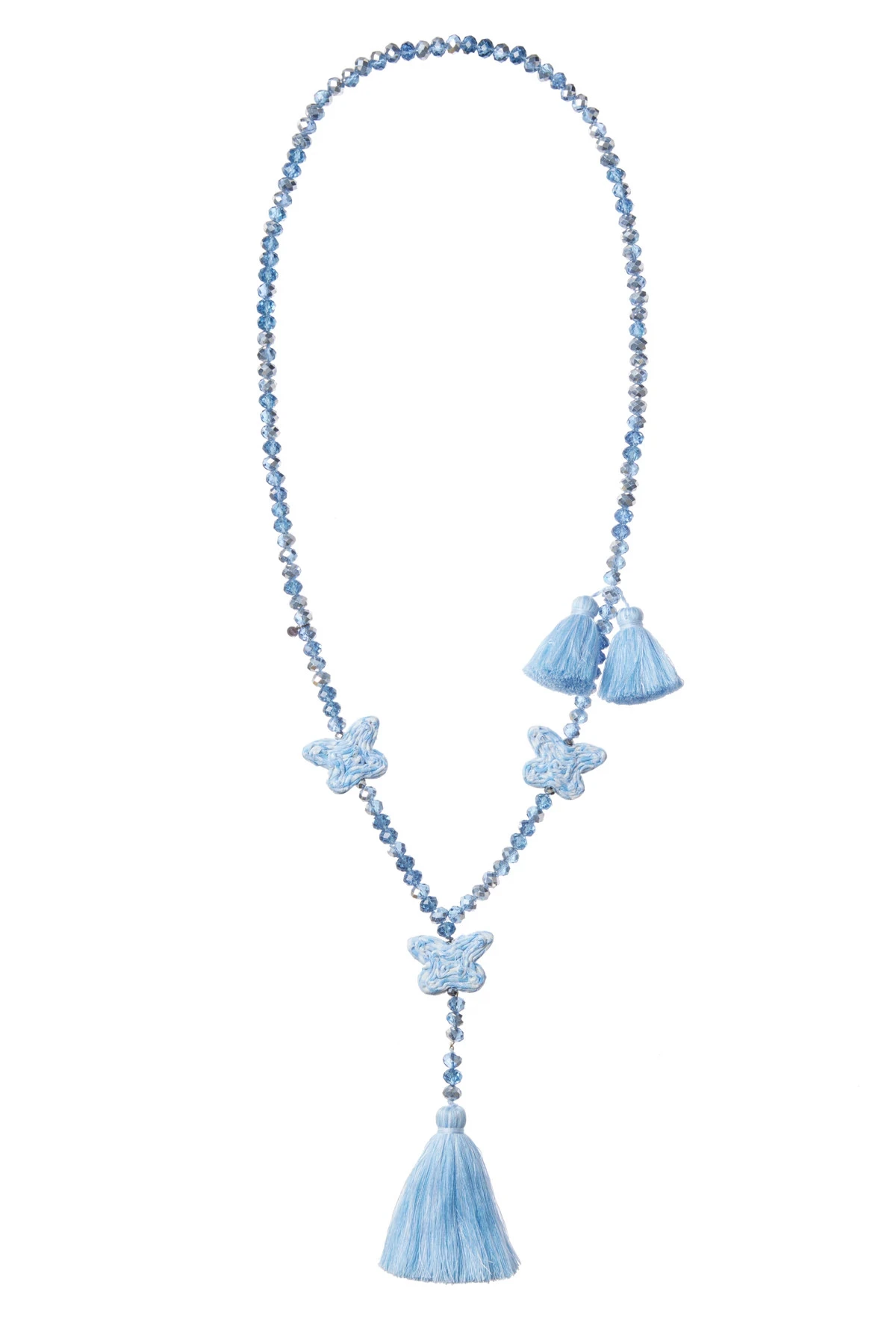 Necklace features soft blue beading with decorative butterflies and tassels.