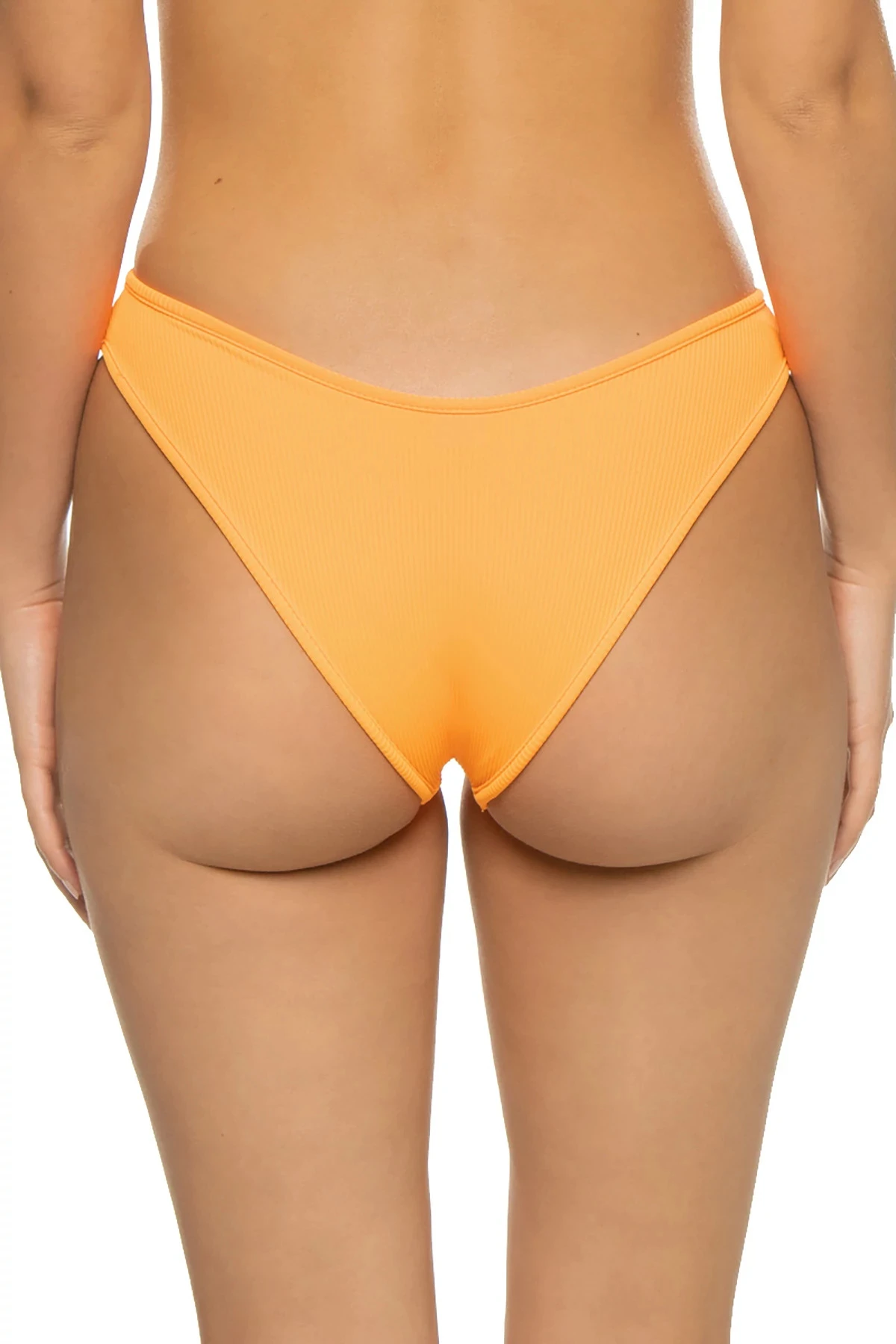 Lulu brazilian bikini bottom features a retro style silhouette in a textured fabrication with a v-shape waistband and offers a high leg cut with minimal coverage.