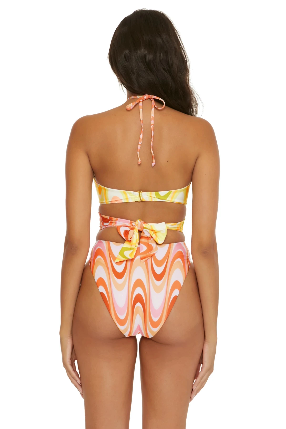 Margot one piece swimsuit features a retro optical geo print with a high neck and ring accents. Offers adjustable halter ties, a hook back closure, sash tie belt, and moderate bottom coverage.