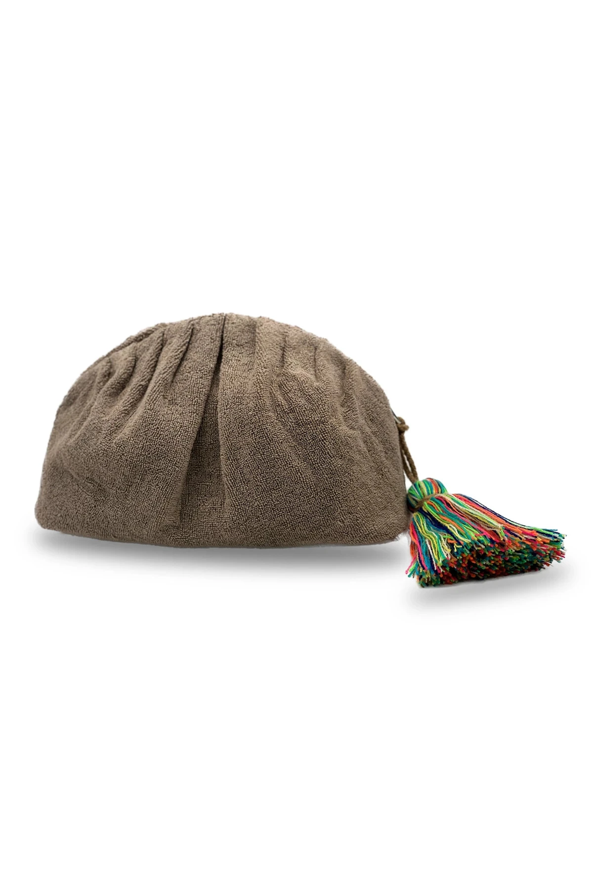 Maya clutch features 100% cotton terry material and a chunky multi-colored tassel. Zip closure.