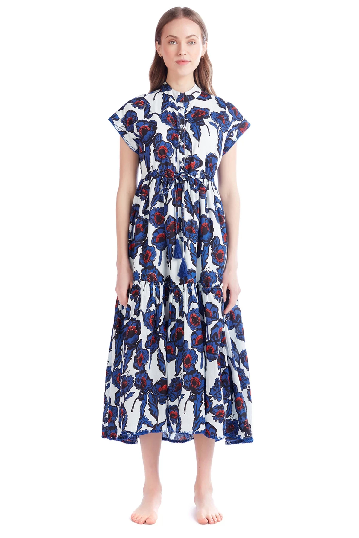 Mumi midi dress features an empire waist with a tiered ruffle skirt and offers front button closures.