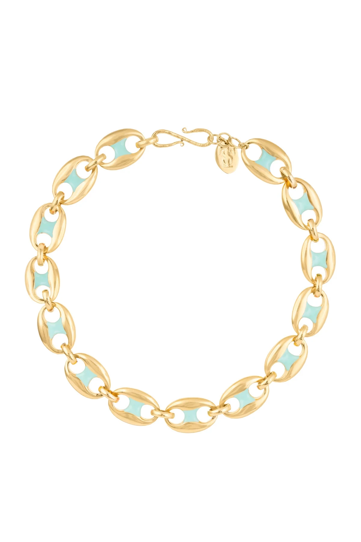 Necklace features thick chain links.