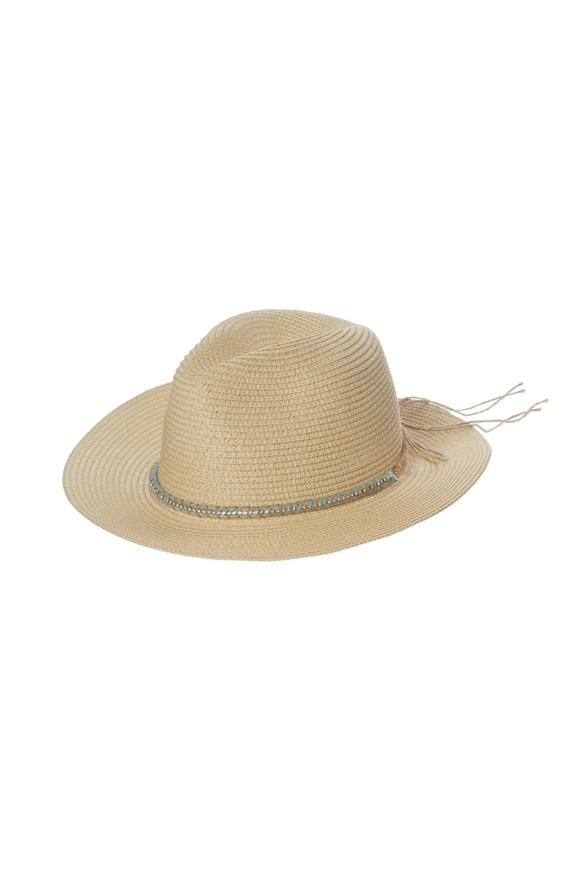 Panama hat features a paper straw fabrication with a rope detailed band.