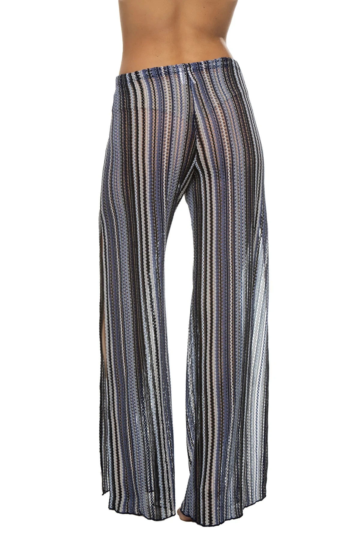 Pierside pants feature an open weave crochet body with side slits and offers an adjustable waist tie.