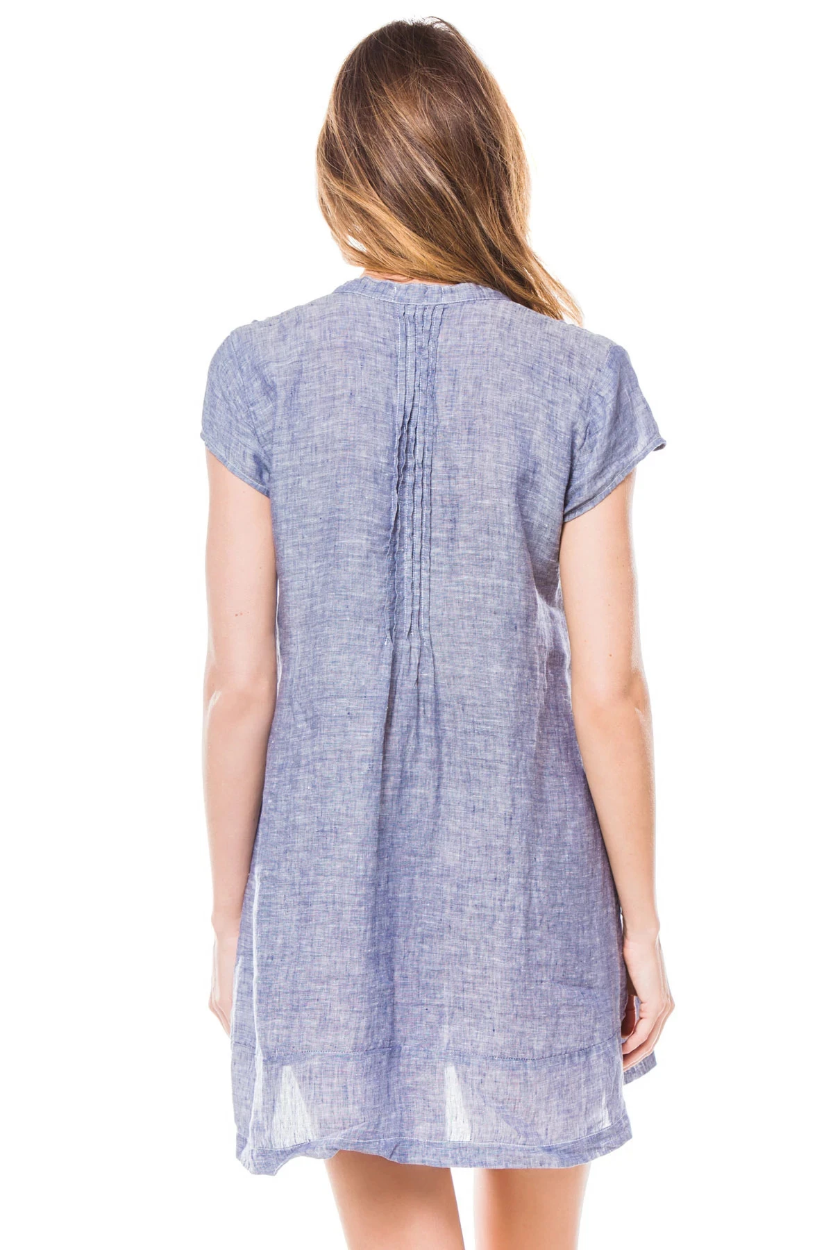 Regina pleated tunic with front pin tucks and cap sleeves.