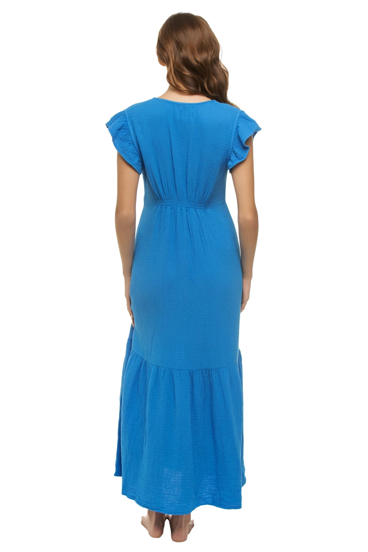 Ruby midi dress features a gathered bust with a v-neckline, ruffle cap sleeves, and a tiered flowy skirt.