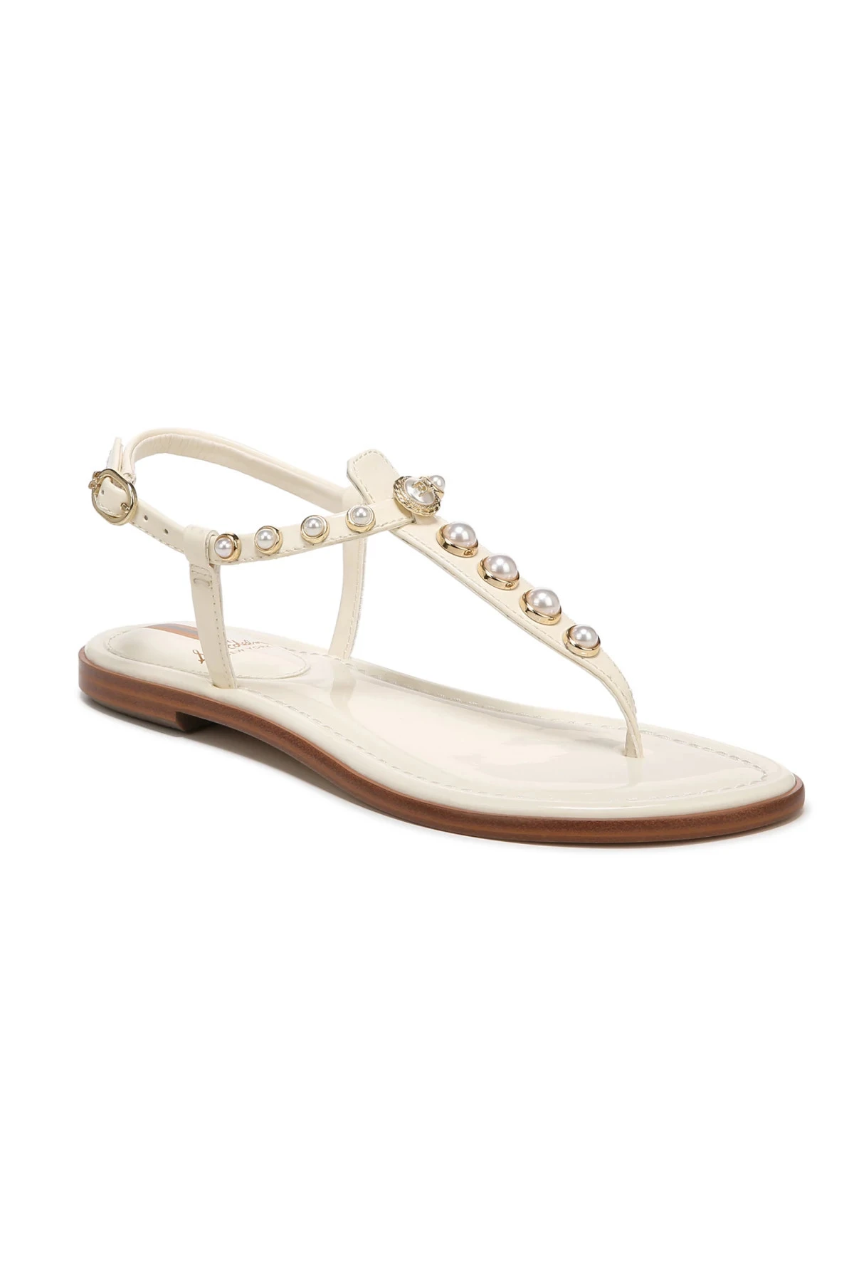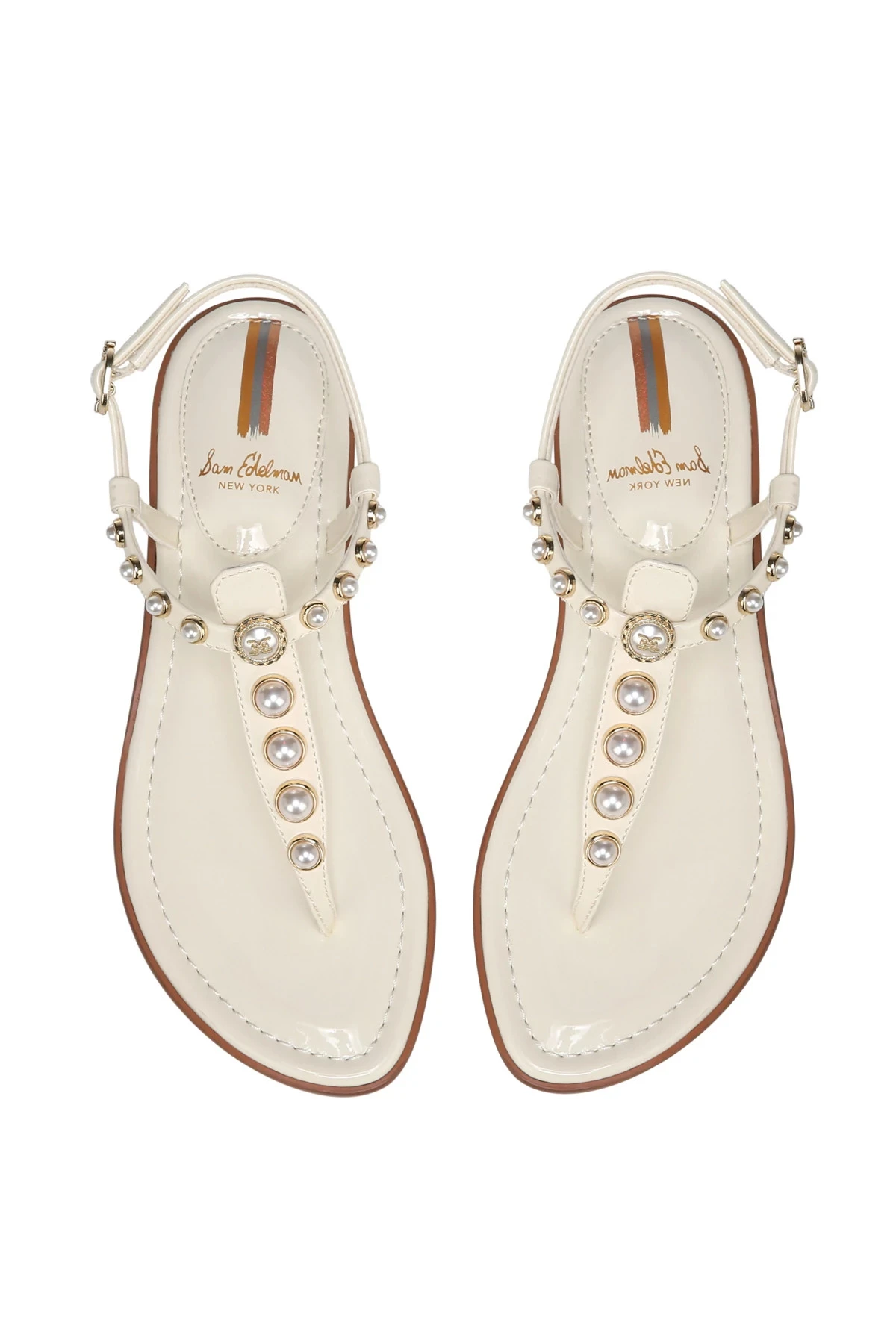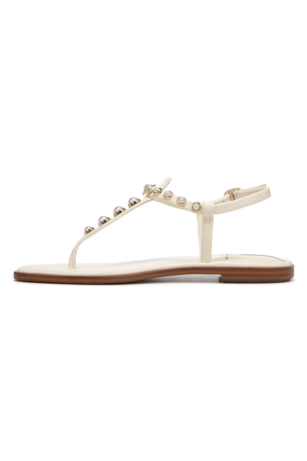 Gigi sandals feature a t-strap design adorned with pearls and offers an adjustable ankle strap.