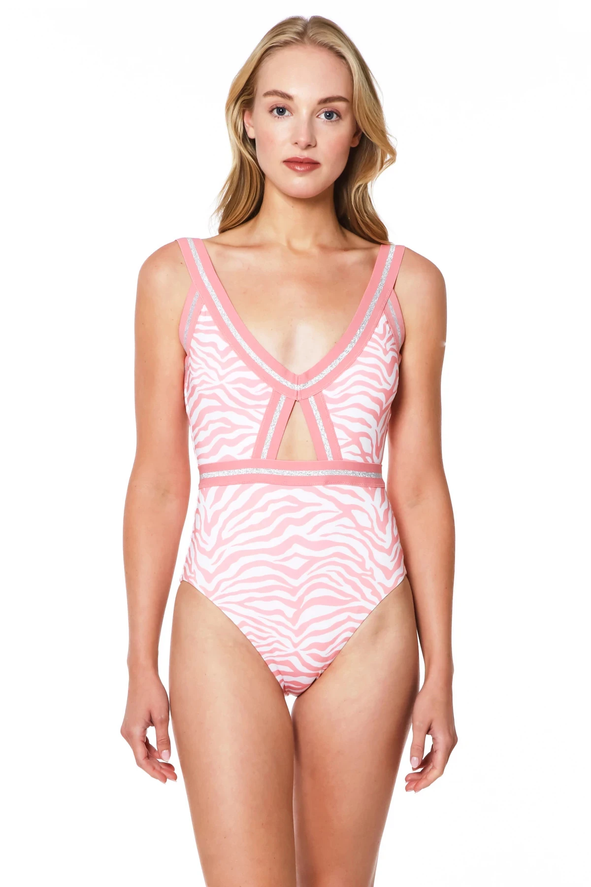 Monokini one piece swimsuit features a tiger print, removable cups, and center cutout. Offers adjustable shoulder straps, a hook back closure and moderate bottom coverage.
