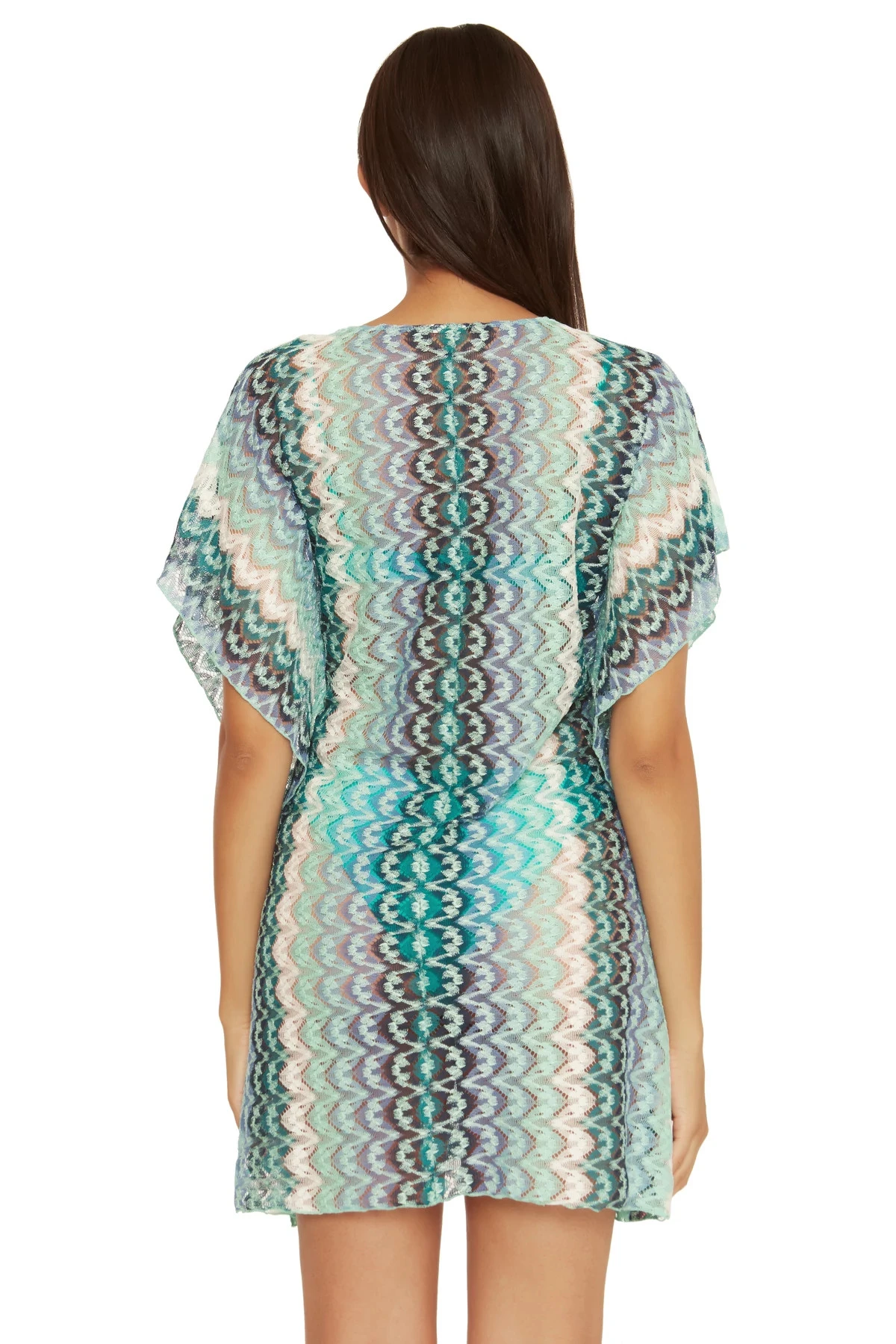 Solstice tunic features a multi-colored crochet fabrication with a plunging neckline, flutter sleeves with side slit opening and a smocked front waistband.