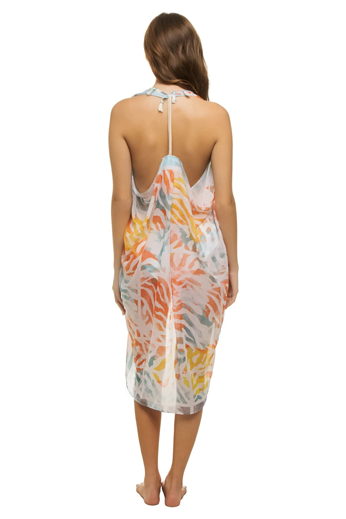 Summer sahara kimono features a sheer design with a T-back strap and can be worn in a variety of ways. Offers a sleeveless fit and full open front.