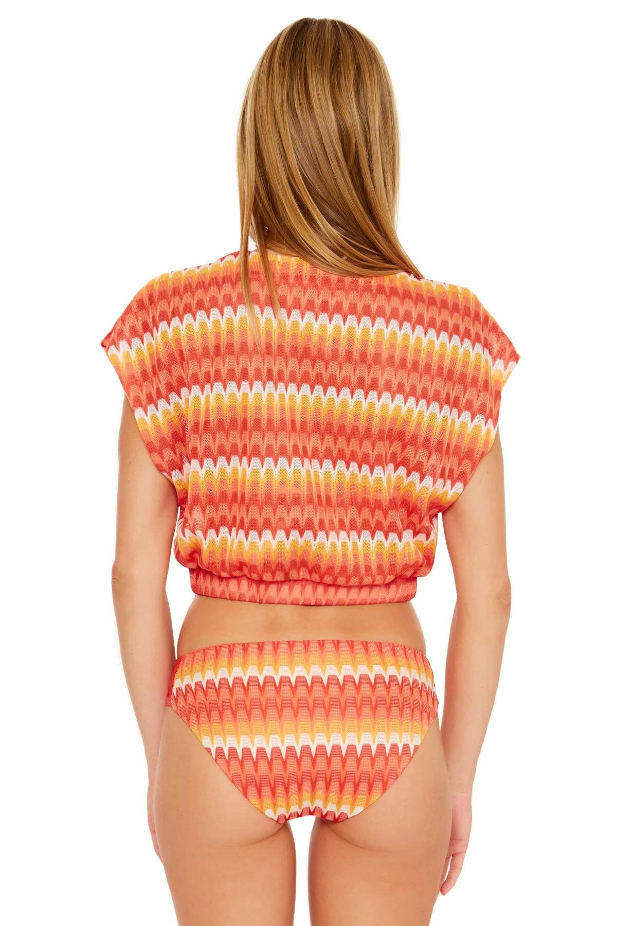 Sunray crochet crop top features a plunging neckline with an elastic waistband.