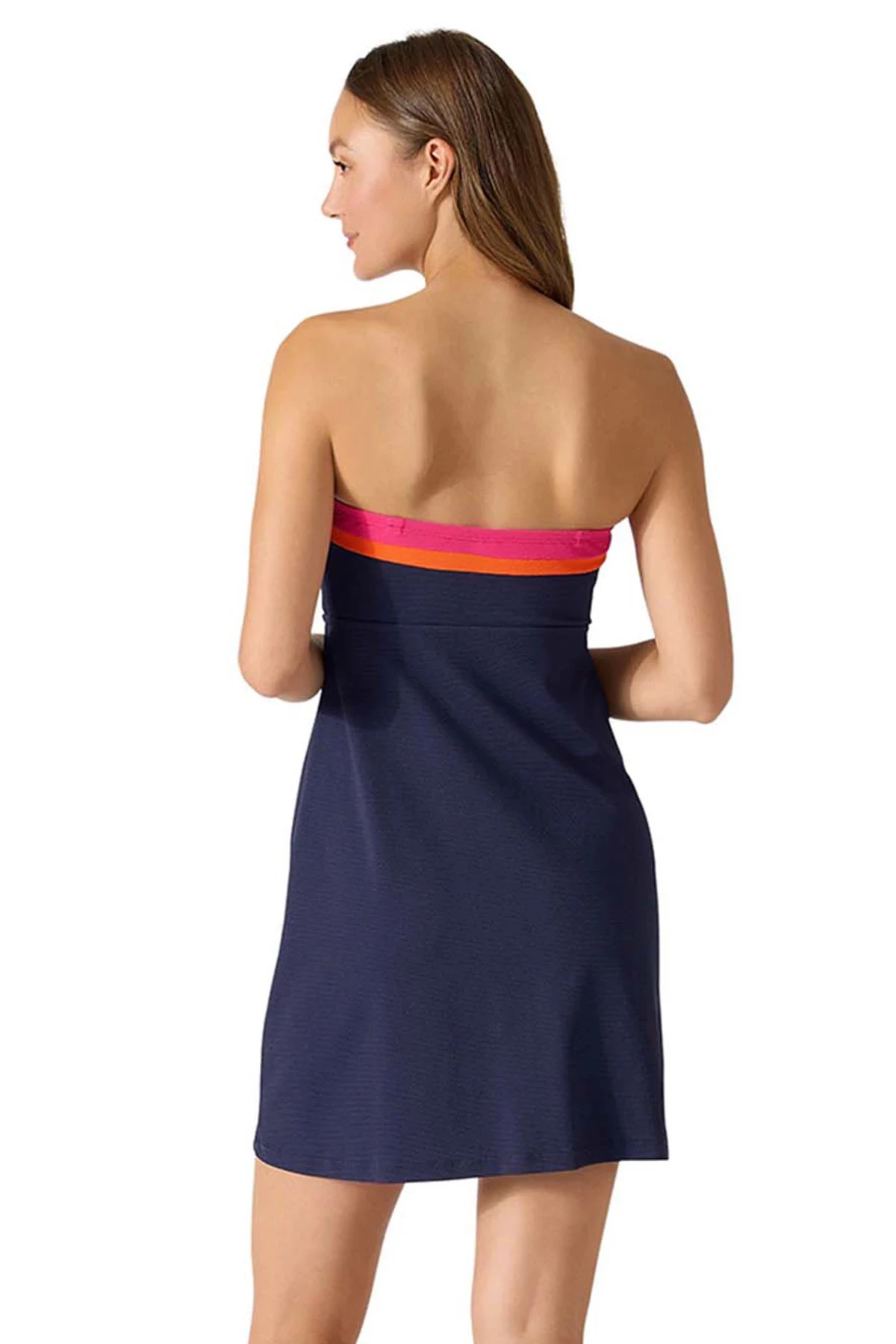 Spa dress features a color block texture with molded cups and side pockets. Offers removable straps.