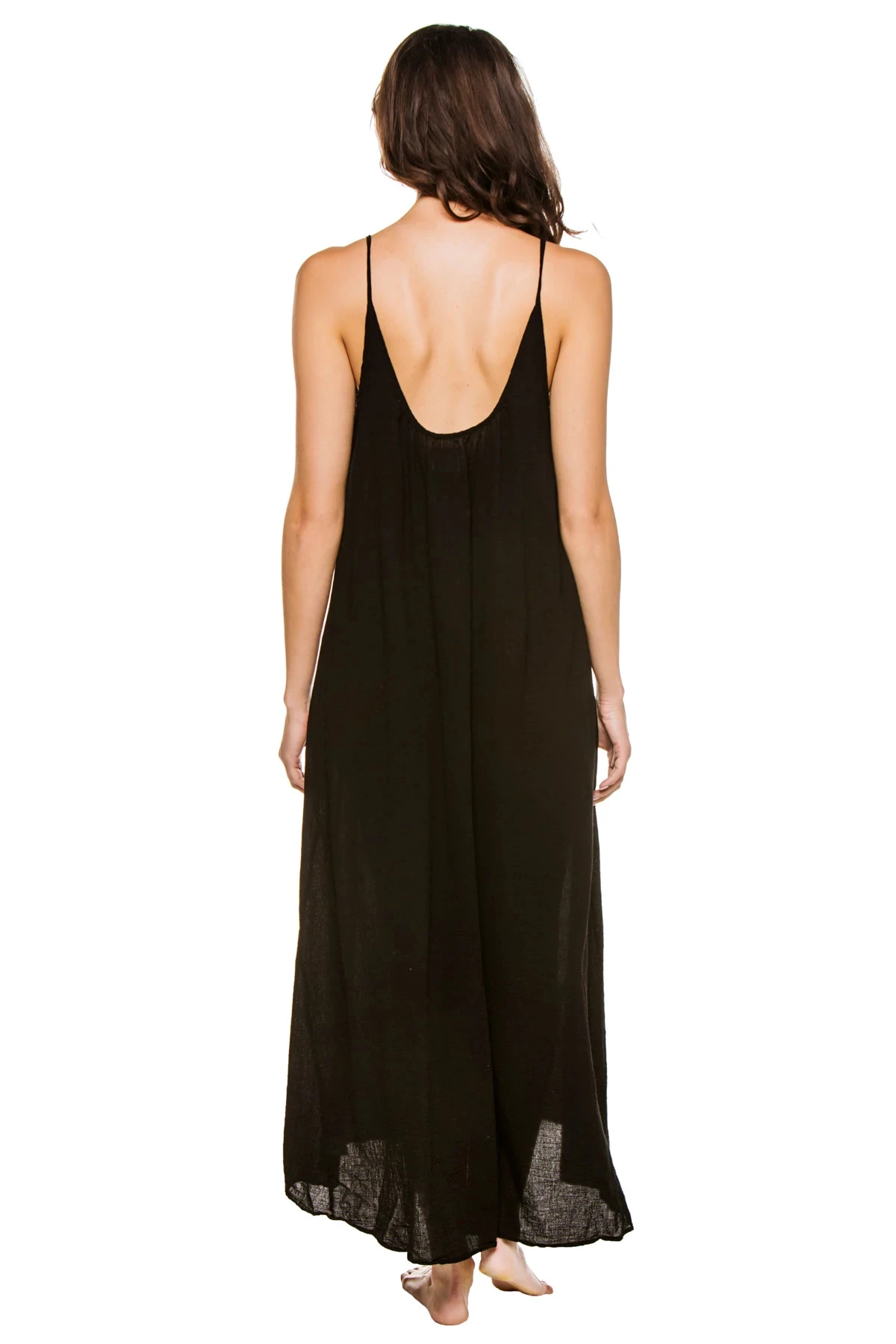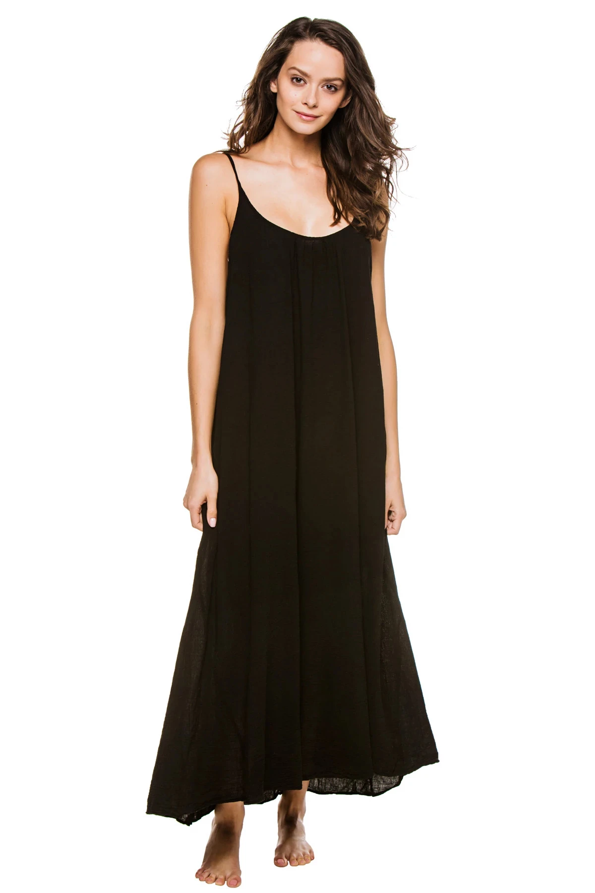 A semi-sheer, gauze maxi dress with a gathered scoop neck