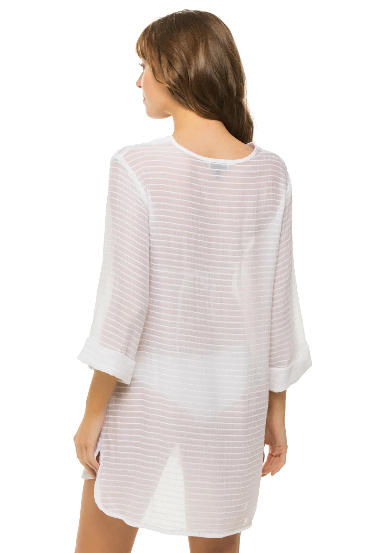 Tunic features a sheer striped chenille with three quarter length sleeves and a v-neckline that offers lace up ties.