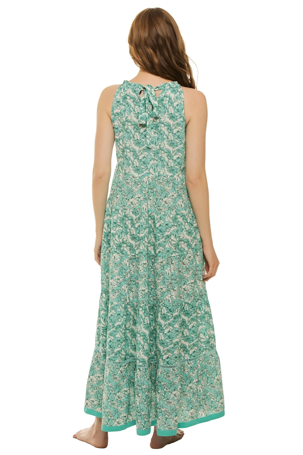 Valley maxi dress features a gathered neckline with tiered ruffles and offers a relaxed fit with ties at back neck.